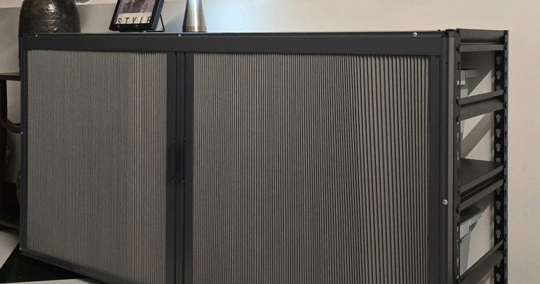 Sản phẩm được phát triển trên nền tảng kệ sắt gài linh hoạt, kết hợp với cửa tủ rèm tổ ong dạng trượt – một chi tiết mang tính điểm nhấn.